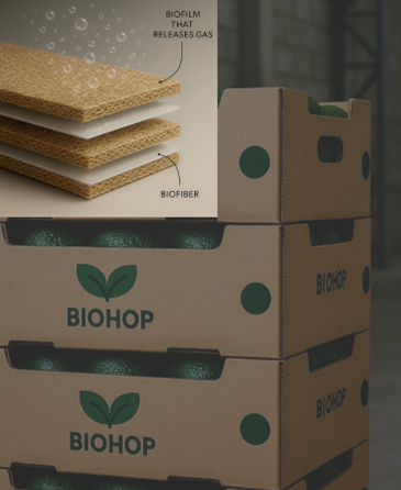 En BioHop desarrollamos bioempaques activos 100% compostables, diseñados especialmente para la exportación de frutas y hortalizas. Nuestros empaques incorporan tecnología de liberación controlada de dióxido de cloro, que inhibe el crecimiento de microorganismos, prolonga la frescura de los productos y reduce significativamente las pérdidas por contaminación. Elaborados a partir de seudotallo de plátano, un residuo agrícola abundante y renovable, nuestros empaques conservan la resistencia, firmeza y funcionalidad de los empaques convencionales, pero con un enfoque ambientalmente responsable.